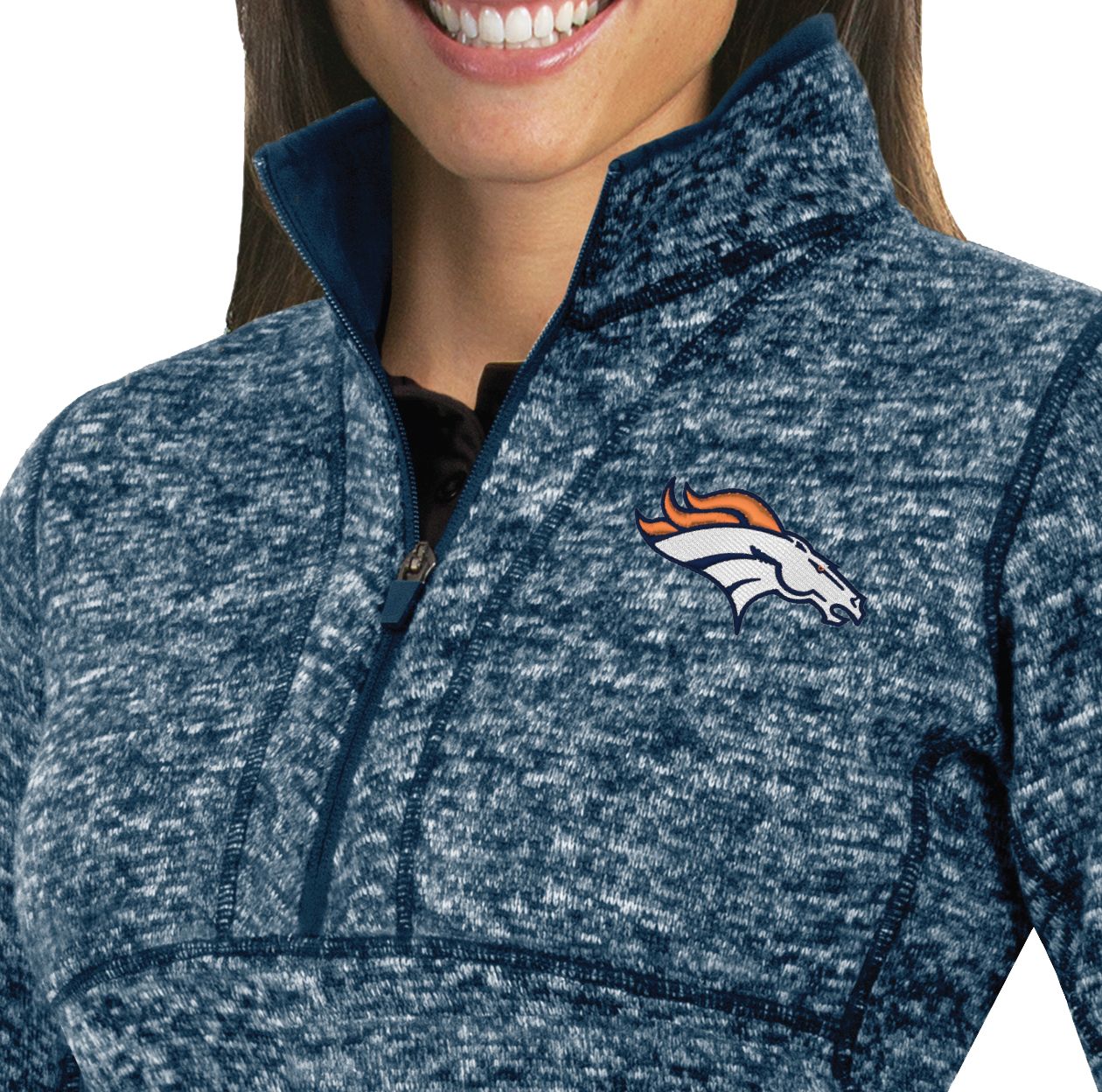 Great for layering in the winter or sporting on its own at the tailgate, the Antigua® Denver Broncos Fortune Pullover Jacket shows your NFL allegiance in complete comfort, thanks to soft, brushed-back fleece and the mock neck design.
