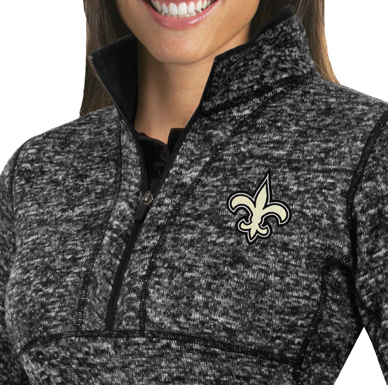 Great for layering in the winter or sporting on its own at the tailgate, the Antigua® New Orleans Saints Fortune Pullover Jacket shows your NFL allegiance in complete comfort, thanks to soft, brushed-back fleece and the mock neck design.