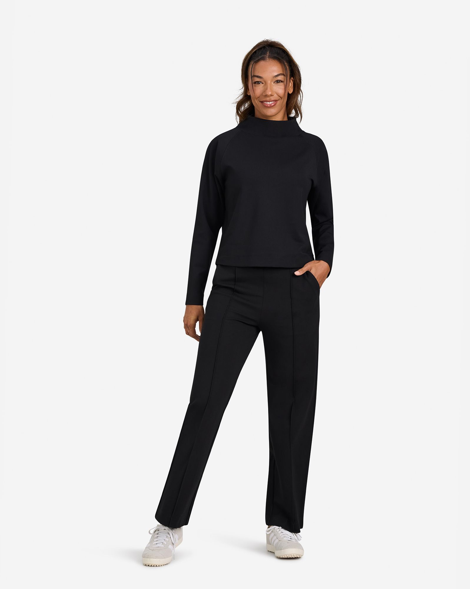 Elevate your game and your style with our straight leg golf pant, crafted from luxe ponte fabric for the perfect blend of comfort and polish. Designed with a sleek pull-on elastic waistband, functional hand pockets, and refined pintuck detailing on both the front and back, these pants offer a tailored look with effortless ease. The ponte fabric provides a soft yet structured feel, offering stretch and recovery that moves with you—whether you're teeing off or heading to brunch. Wrinkle-resistant and breathable, it's the ultimate all-day, on-and-off-course pant.