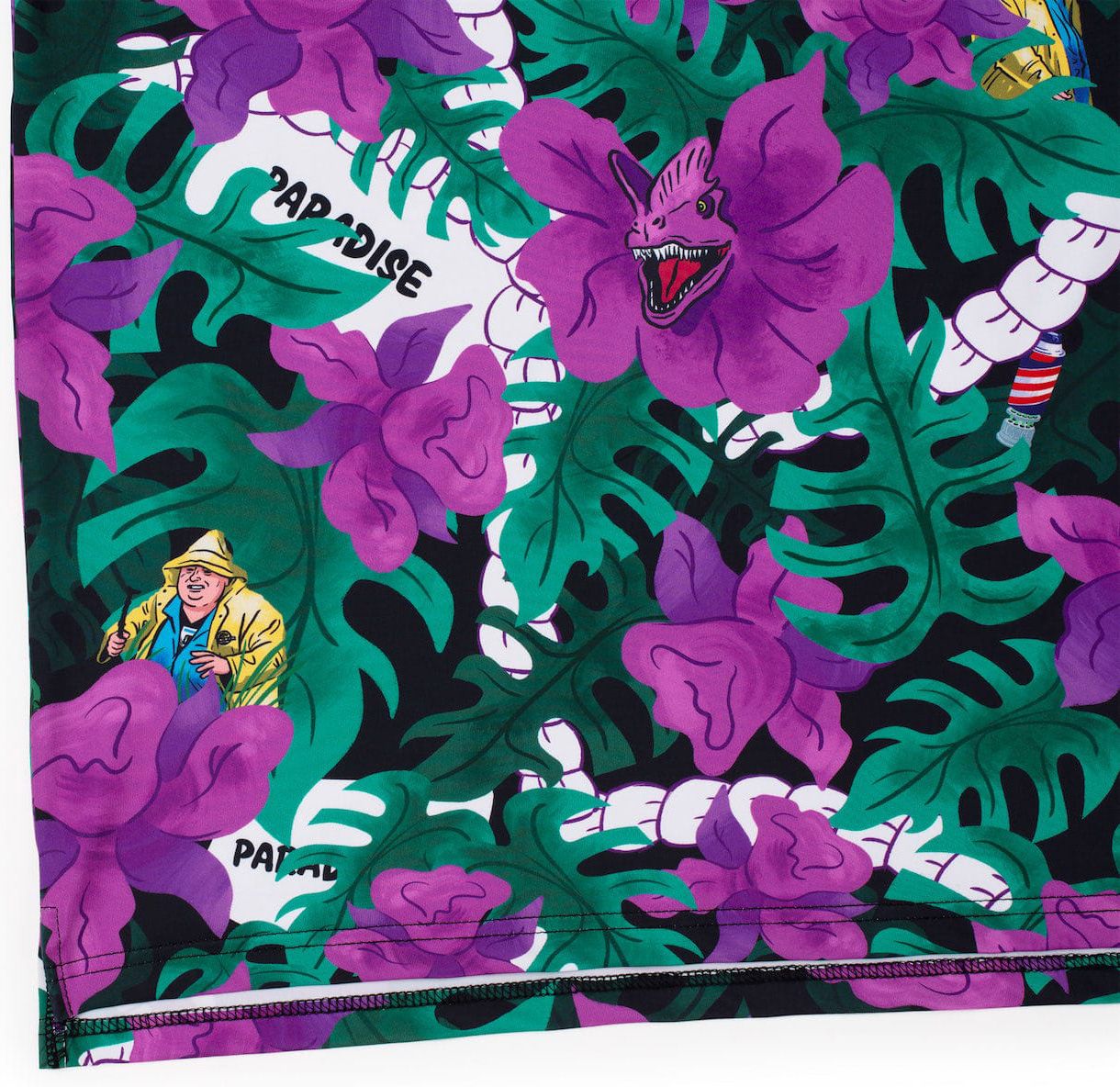 - All-over tropical print includes iconic details from the Jurassic Park movie
