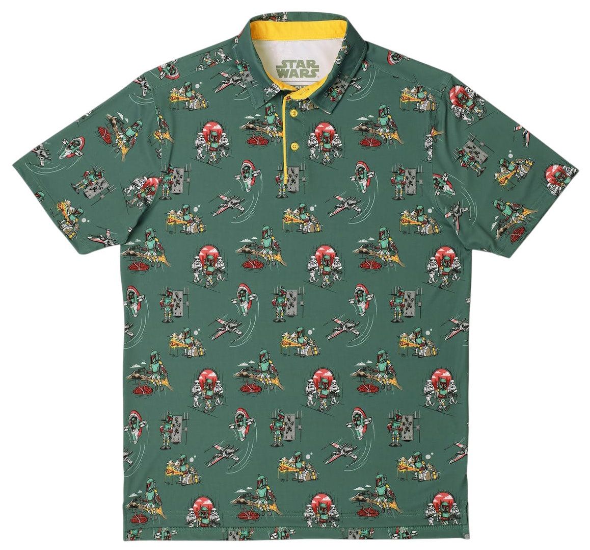 A polo that would make any bounty hunter set their helmet aside. Remove your armor and slip into a comfortable polo printed with Boba Fett’s best escapades, in case you need inspiration after the 18th hole.