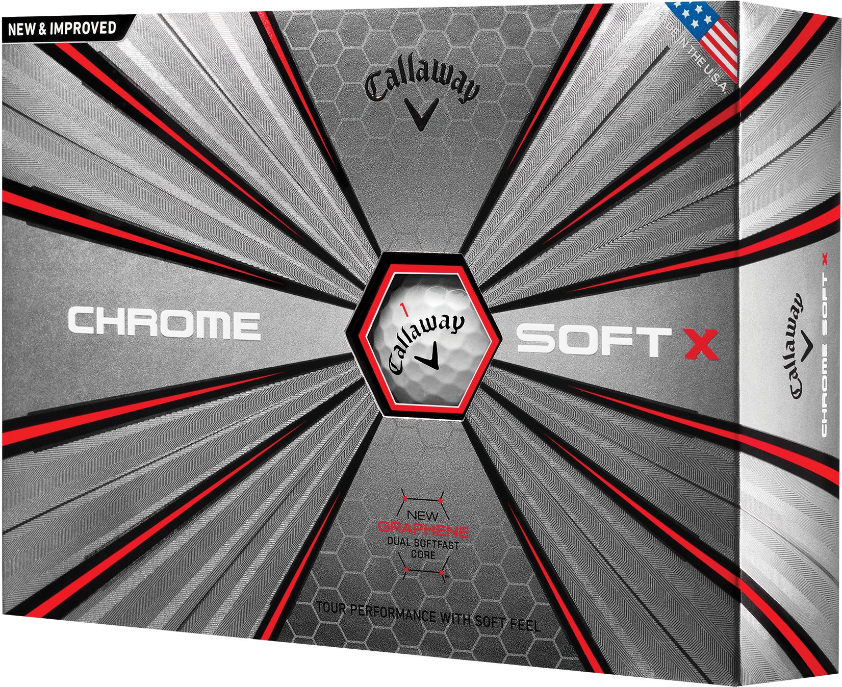 Innovations at every layer result in Callaway Chrome Soft X Golf Balls. Designed to combine Tour-proven performance with unparalleled feel and exceptional forgiveness, Chrome Soft X features a new Graphene Dual SoftFast Core with a larger inner core for high launch, long distance and increased playability. A faster SubMantle pairs with the thin, ultra-soft Tour Urethane cover to deliver fantastic feel and shot-controlling, stroke-saving spin on scoring shots.