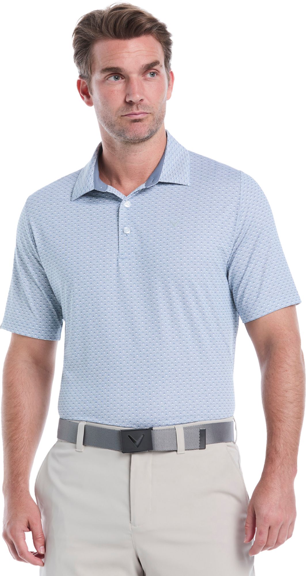 Covered with the trademark Callaway chevron, this men’s golf shirt will add sophisticated style to your athletic outfits. Great for everything from competitive rounds to everyday errands, this versatile, easy-care Callaway shirt is crafted from a lightweight single knit fabric. It has added stretch and Swing Tech™ technology to help ensure a comfortable fit and a full range of motion. Built-in sun protection helps to guard against damaging UV rays, while Opti-Dri™ transfers moisture away from your body to help keep you dry. For an eco-friendly twist, the golf polo shirt is made from 90% recycled polyester.