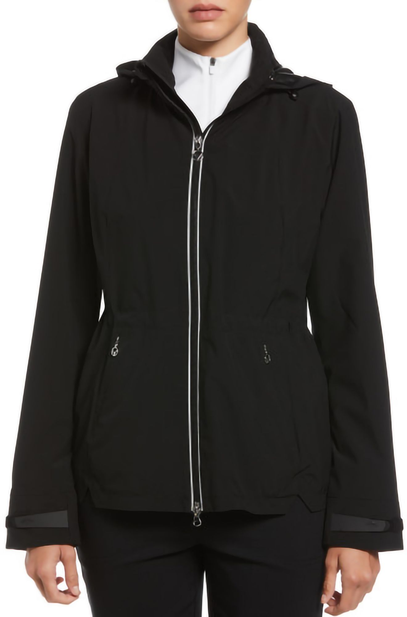 Great for cool and rainy days on the golf course, this practical women's jacket from Callaway is wind and water resistant to help keep you protected from the elements. A hint of stretch in the fabric and Swing Tech™ technology keep the women's golf jacket comfortable to play in, providing the freedom of motion you need to make each shot with your best form. The fabric is crafted with a tight plain weave pattern that stands up well to everyday wear and tear.