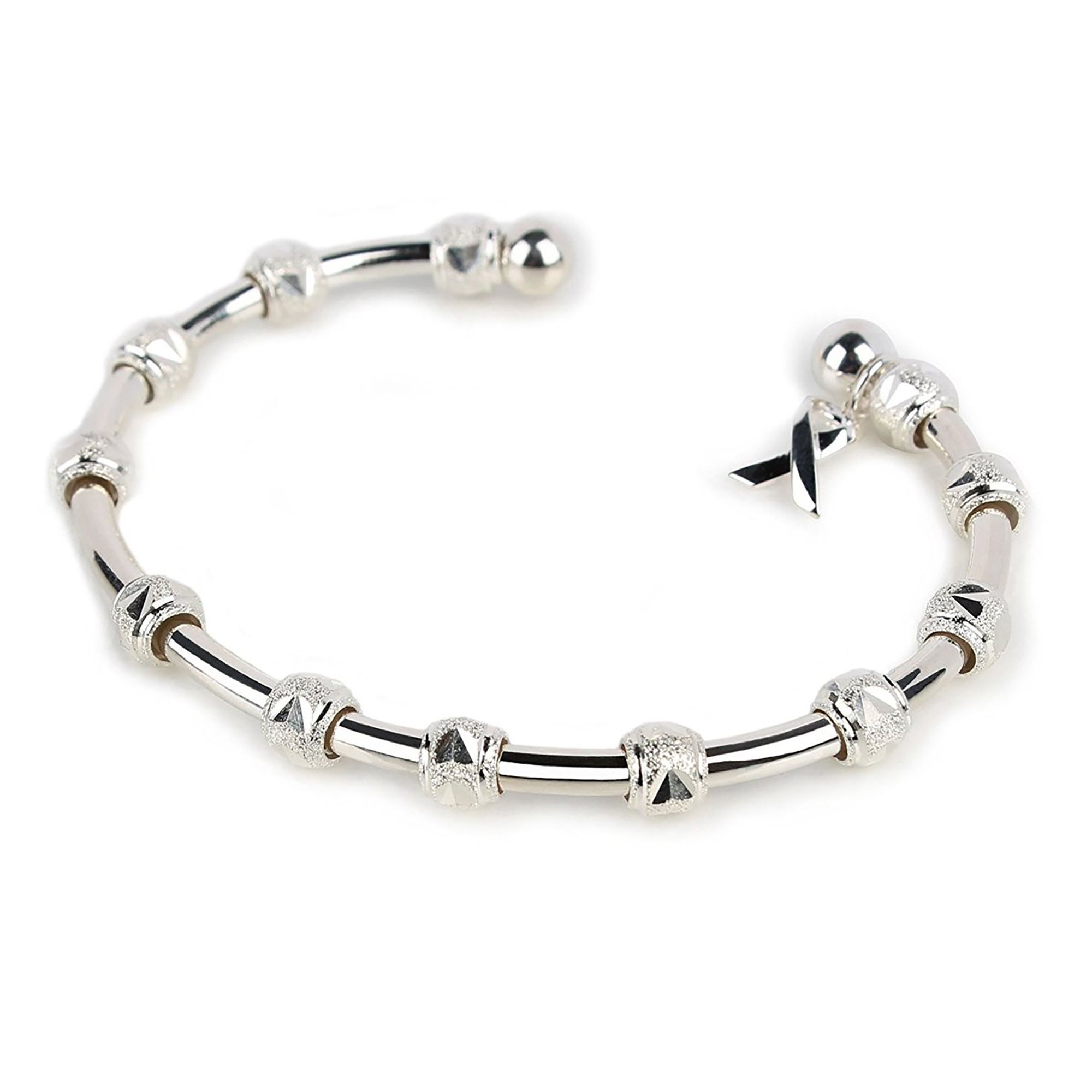 Beads stay in place on the patented bracelet unless moved (one-by-one) by you; sterling silver plated cuff with sterling silver plated hand-etched heart-patterned beads and cause ribbon charm