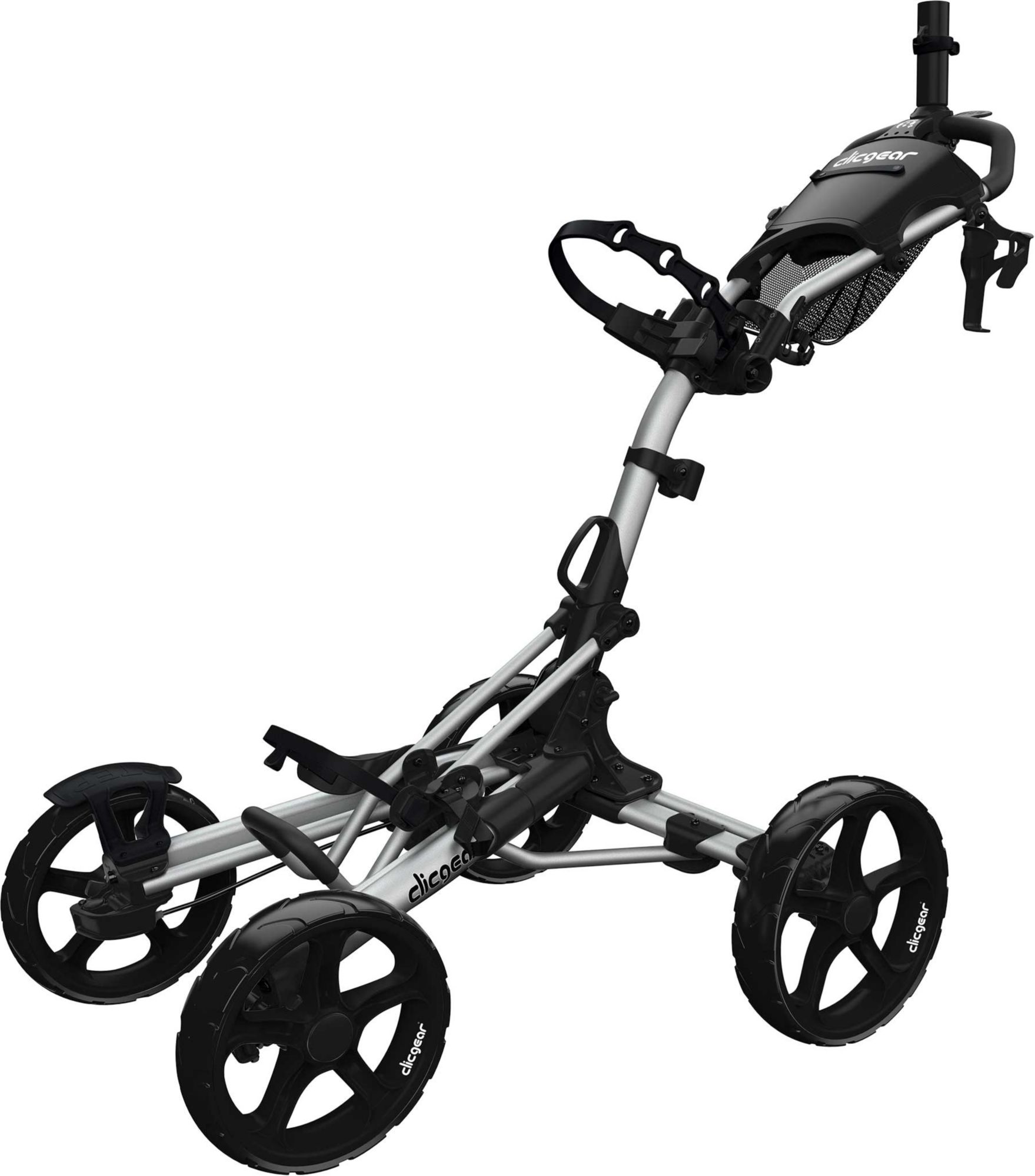 Push your way to a personal best score with the Clicgear Model 8+ Push Cart. Four solid, maintenance-free tires provide exceptional stability while the top panel offers scorecard, golf ball, tee and beverage storage and the Clicgear Silicone Strap System prevents twisting and turning during your round.