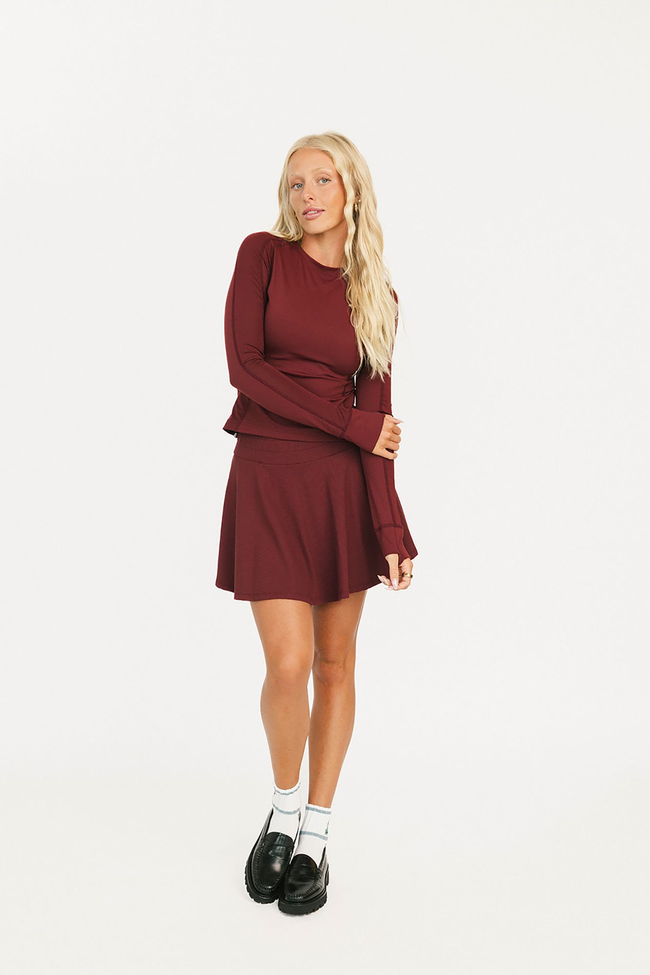 Core uniform, but make it sporty. Part of the Fore All School of Golf collection, the Marie Long Sleeve is your first-round draft pick for layering up. Designed for movement, breathability, and on-course confidence, this is your everyday performance base layer—whether you’re teeing off at sunrise or sinking putts at golden hour. Built from our lightweight Fore Flow™ fabric with mesh ventilation panels, it keeps you cool under pressure. With contrast seamlines, a slim athletic fit, and secure thumbholes, it’s made to move (and layer) like a pro. Finished with our signature flamingo patch, it's an essential piece for every member of Team Fore All.