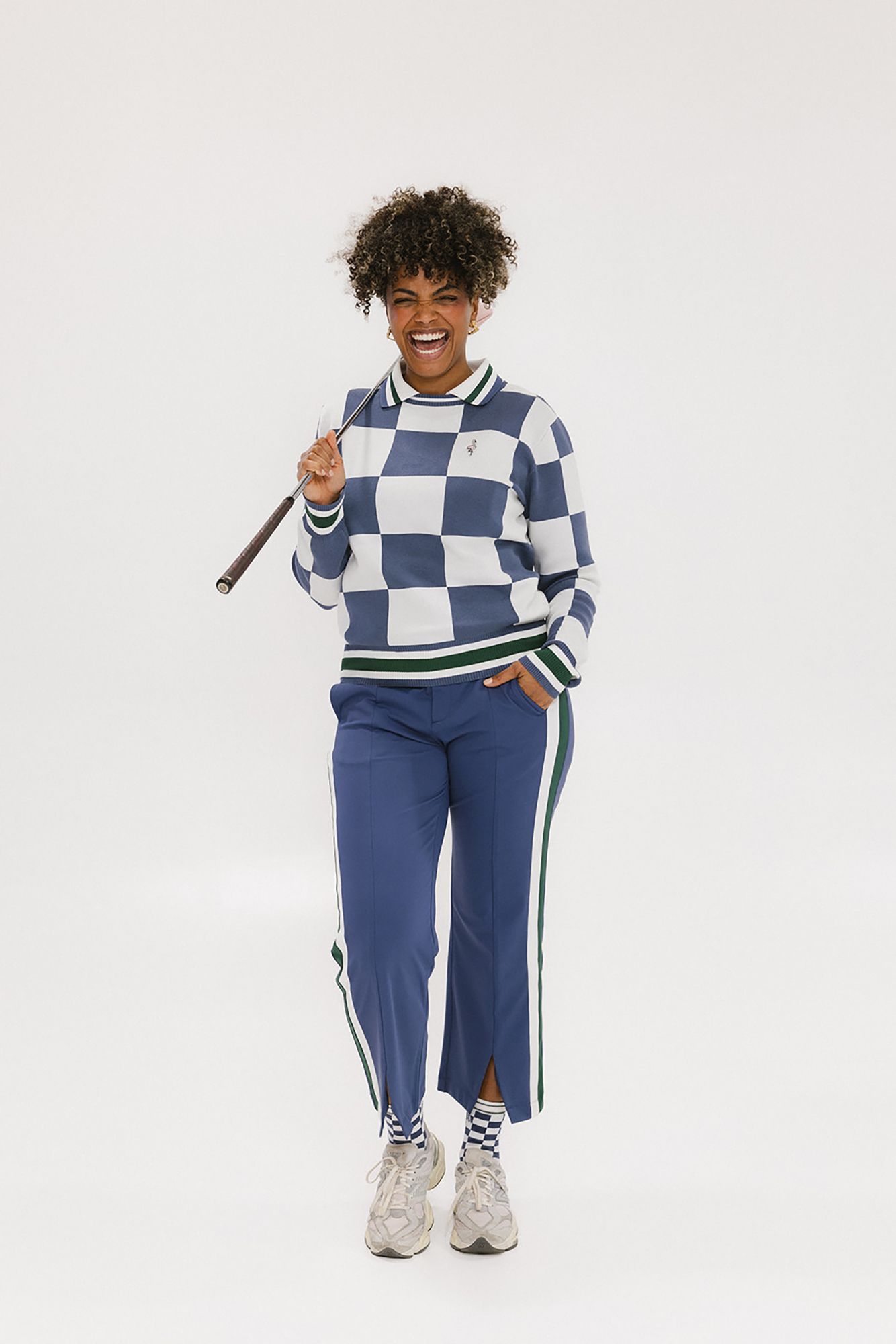 Inspired by the unstoppable Simone Biles, these pants are all about style, performance, and a little extra flair. Featuring princess seams down the leg with a slit at the hem and stripes for added pop, the Simone Pant is designed to turn heads on and off the course. With front and back pockets, a zipper fly with snap closure, and the subtle Fore All logo above the upper right pocket, these pants combine functionality with fashion. From the office to the green, the Simone Pant is your new go-to for bold, effortless style.