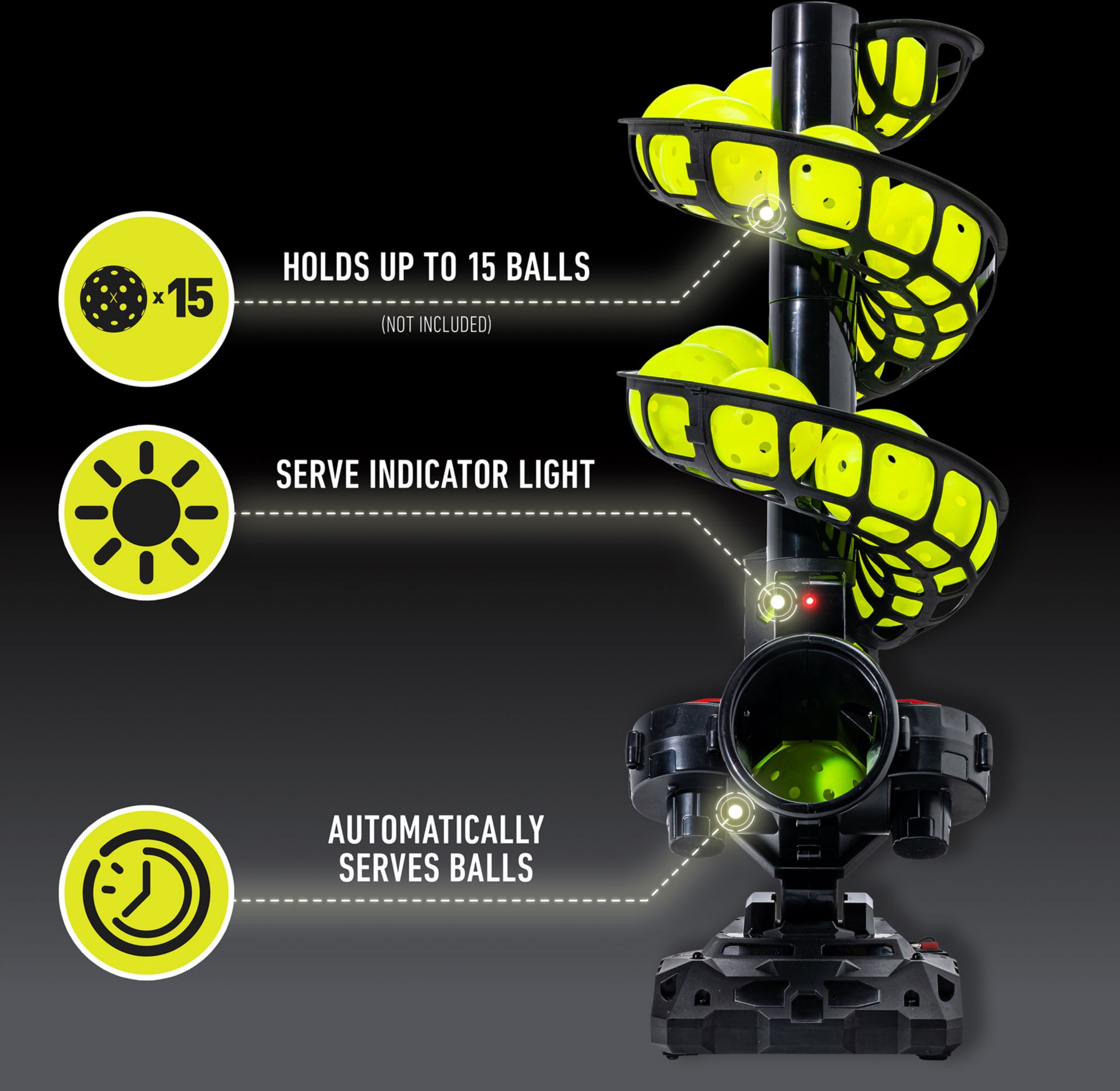 The Franklin Sports ProShot Automatic Pickleball Launcher Machine is a compact, portable and convenient piece of pickleball equipment to take your pickleball training to the next level. This easy to assemble pickleball tosser can hold up to 15 pickleballs at a time and will automatically launch them every 8-9 seconds. Practice your topspin, sidespin, backspin, serve receive, volleys and dinks with ease. This portable pickleball launcher comes with a sturdy base and can be powered by (4) D batteries (not included) or the A/C power adaptor, so you can practice in the garage or out on the court. This machine is the perfect piece of pickleball training equipment to help all players develop their skills and play their best, so get your Franklin ProShot Automatic Pickleball launcher today and elevate your game!