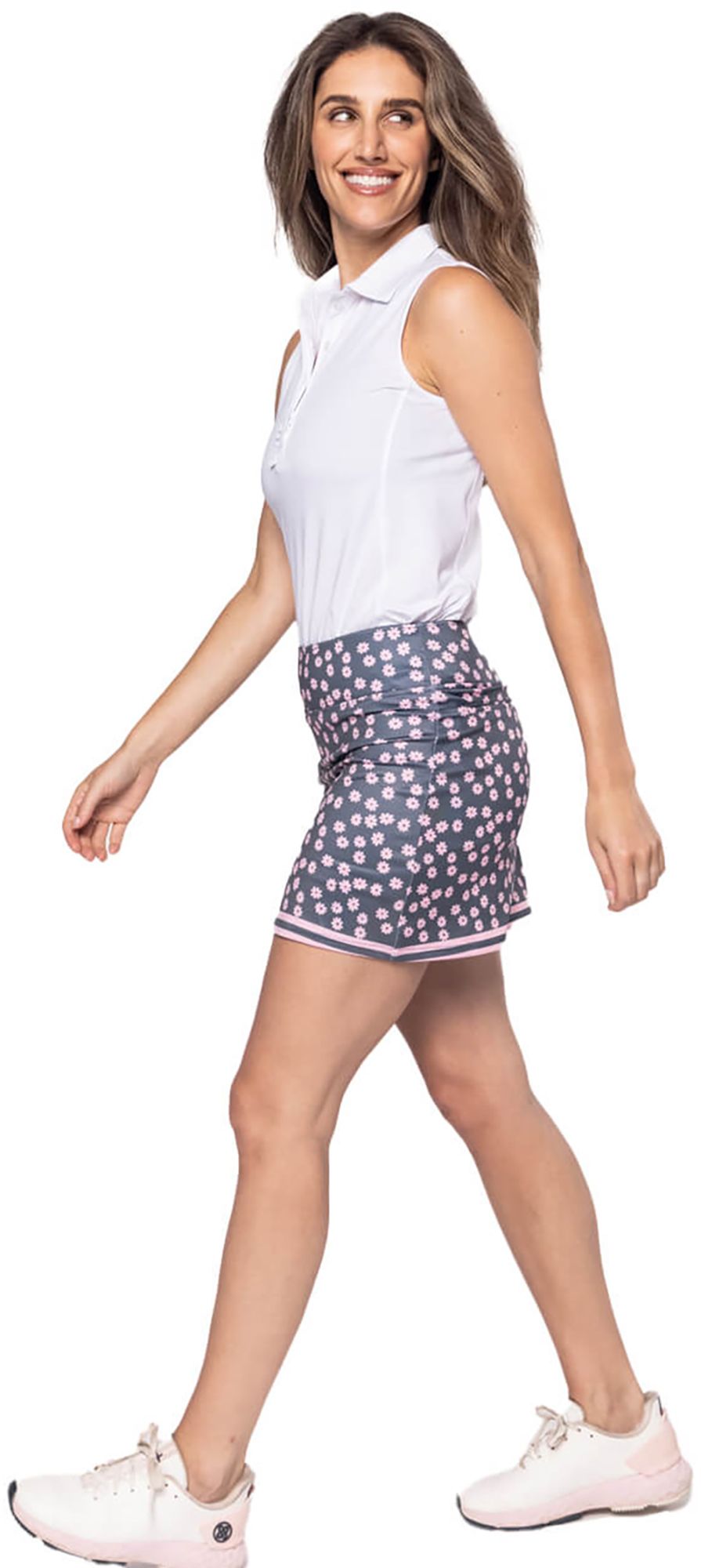 Unleash your inner champion with our Tee Time Skort. Made for golf lovers, this skort features two back pockets for convenience and a stunning slate grey and rose pink print, paired with pink engineered trim. Elevate your game and look elegant on the course.