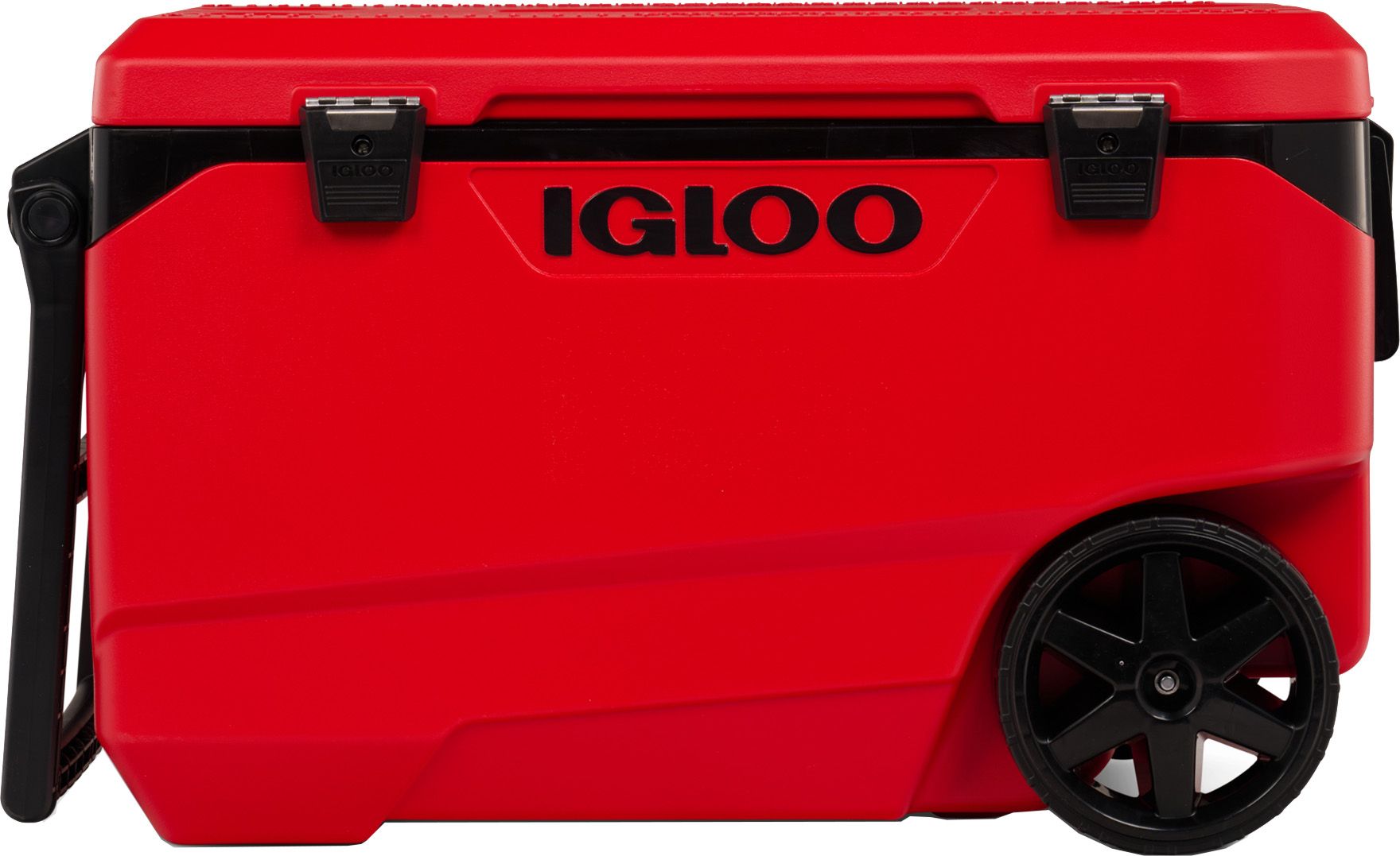 The Igloo® Latitude 90 Quart Rolling Cooler is extremely durable and has all-terrain wheels for easy travel. The flip and tow handle reduces your towing force by up to 50%. The Latitude 90 Quart Cooler can hold up to 137 cans and has 4 self-draining beverage holders located on the lid. With a media slot, you can secure your mobile device right on top of the cooler.