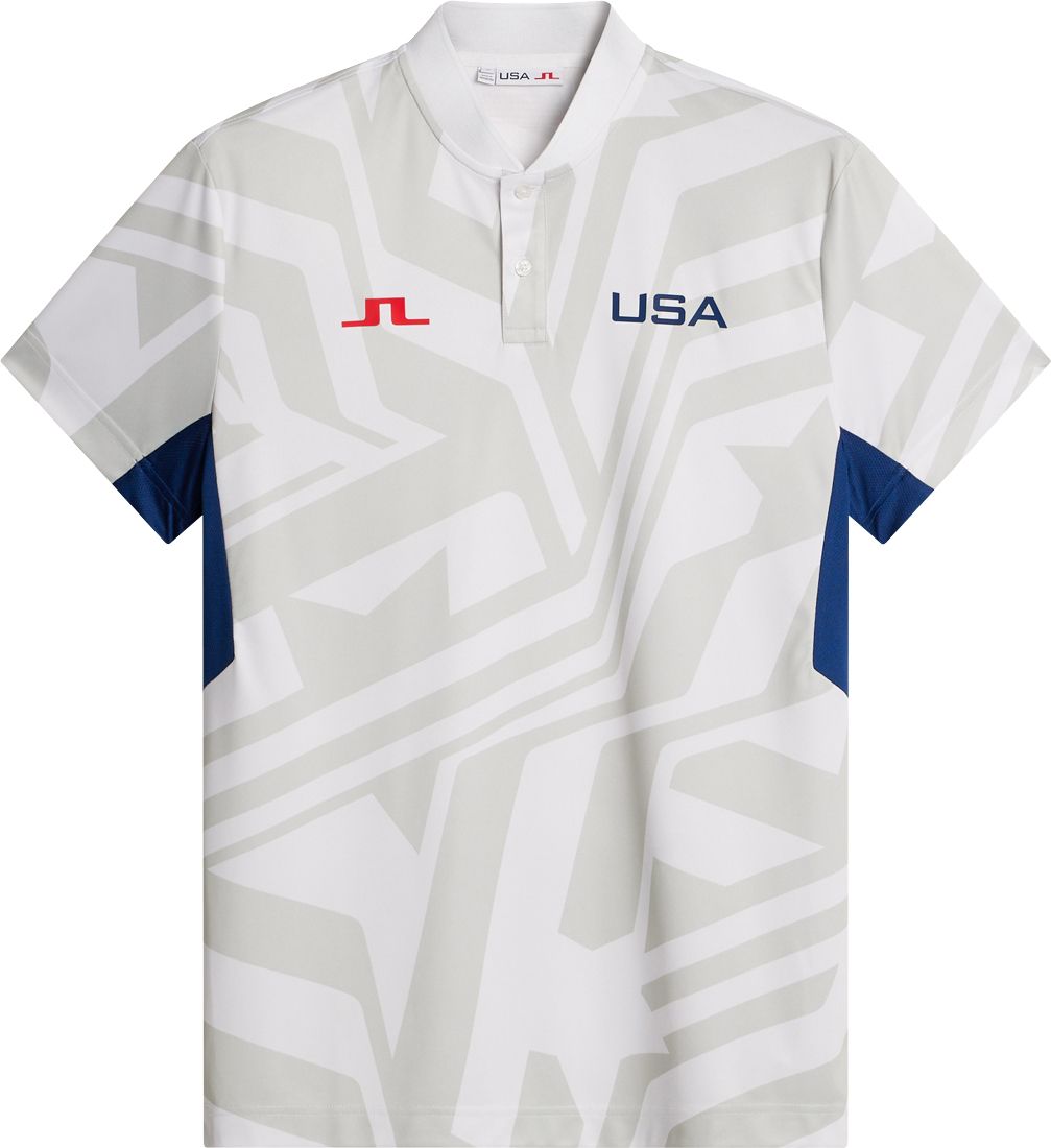 Introducing our Emeric Golf Polo Shirt featuring a sleek baseball collar crafted in a technical TX Jersey fabric with all-over jacquard for superior breathability and comfort on the course. Cut in a regular fit with a classic silhouette. It features a knitted baseball collar that adds a sporty touch, while the USA silicone logo on the chest, combined with the iconic Bridge silicone logo and an embroidered USA flag on the back of the collar, adds an extra patriotic flair. Engineered with mesh inserts, this polo ensures optimal ventilation, keeping you cool and dry during your rounds. The breathable fabric helps regulate your body temperature, ensuring maximum comfort throughout your game