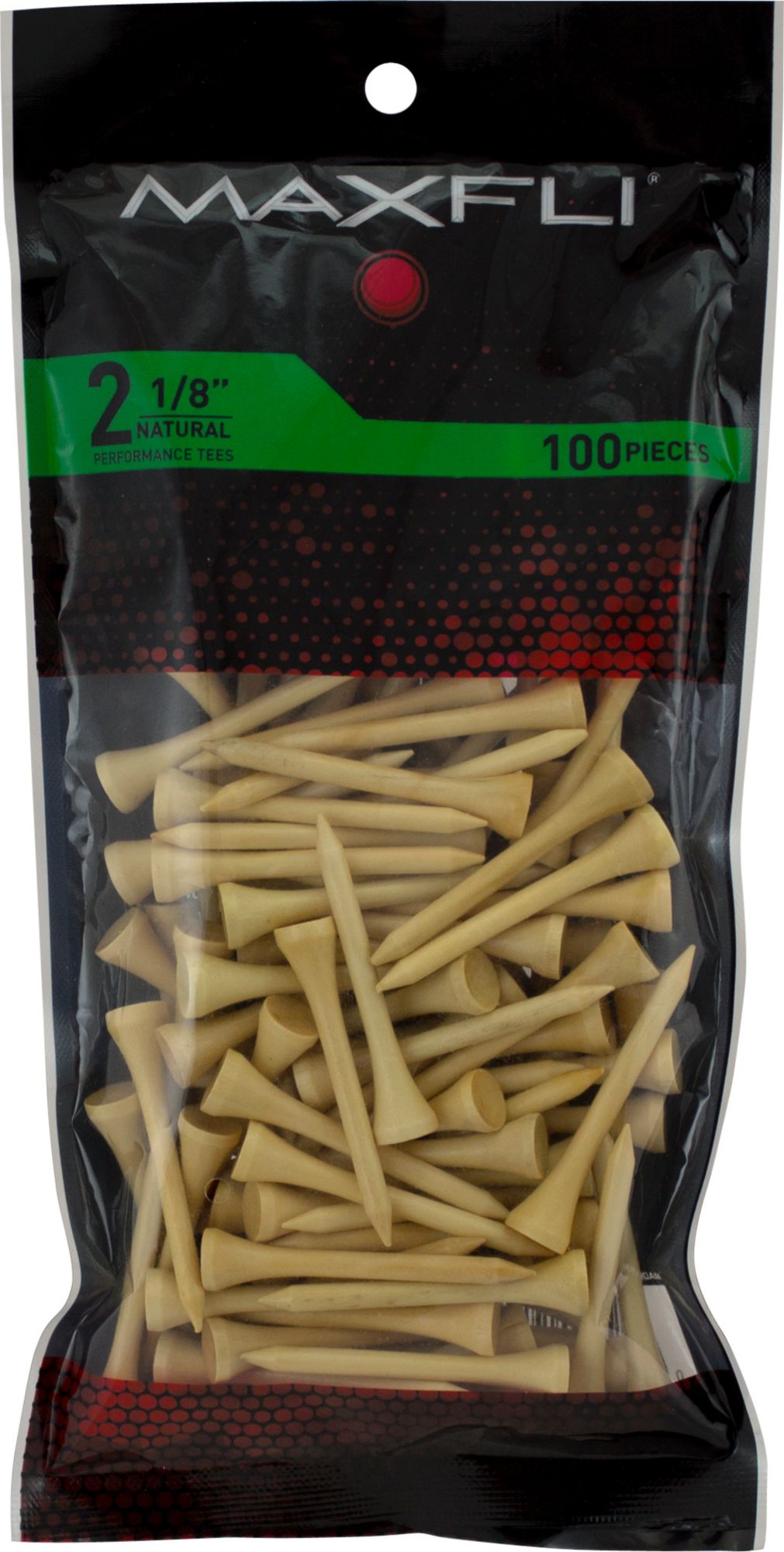 Take to the links and swing for an ace when you use the Maxfli® 2.125” Natural Golf Tees Pack. This natural wood tee assortment comes with 100 pieces, perfect for lasting you through multiple rounds of golf. For a more enjoyable day on the green, the longer tee length enables you to pull out your driver head or push the tee further into the ground to accommodate your iron club.