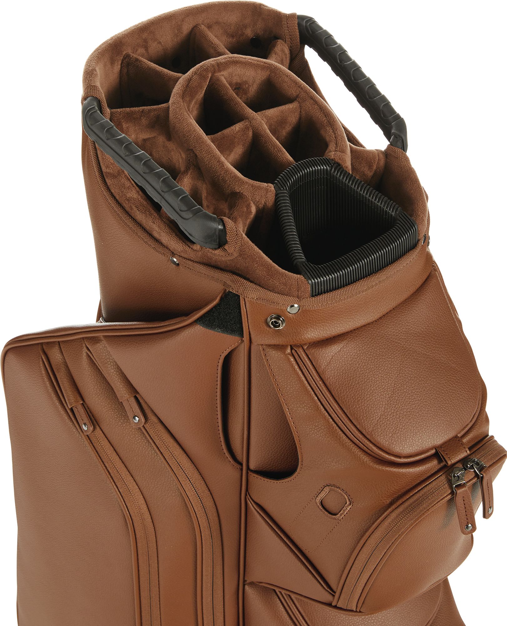 Carry your game in style and convenience with the Maxfli Modern Classic Cart Bag. Designed for the golfer who values organization, this bag features a 14-way top with full-length dividers to keep your clubs neatly arranged. With multiple velour-lined pockets for valuables, a large cooler pocket for refreshments, and a weather-resistant synthetic leather design, this bag ensures you're prepared for anything the course throws at you.