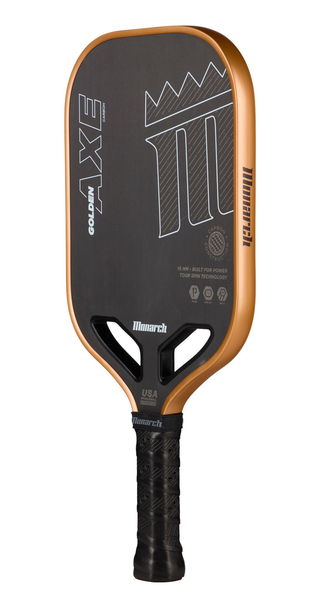 The Golden Axe Carbon is an all-around paddle that can deliver aggressive shots from the baseline in singles play, or forgiveness at the net to hit a hard smash back at your opponents in doubles play. A raw carbon face maximizes spin, while the new dual open throat with center channel provides even greater power and performance.