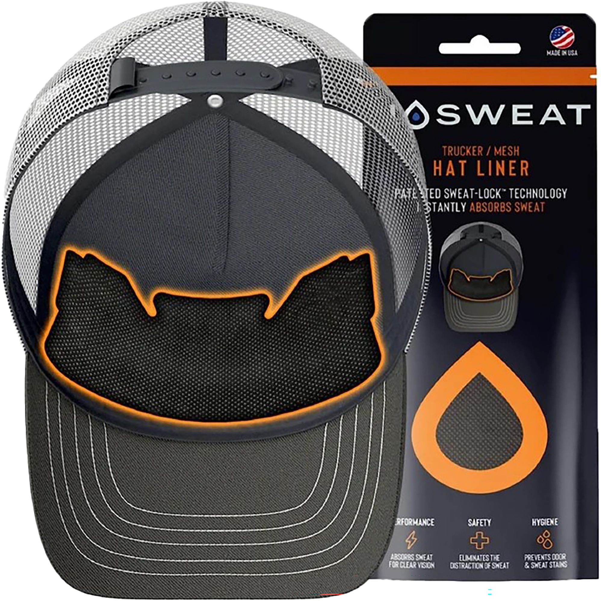 NoSweat® is a disposable moisture-wicking performance trucker & mesh hat liner. This brand new design for Trucker Hat Sweat Liners & Mesh Back Hat Sweat Liners prevents the liner from showing on the side of your trucker & mesh hat and acting like a trucker hat sweatband to soak up sweat. Our patented SweatLock™ Technology is engineered to instantly absorb sweat. NoSweat® is made with hypoallergenic materials that are thin, soft, and lightweight.