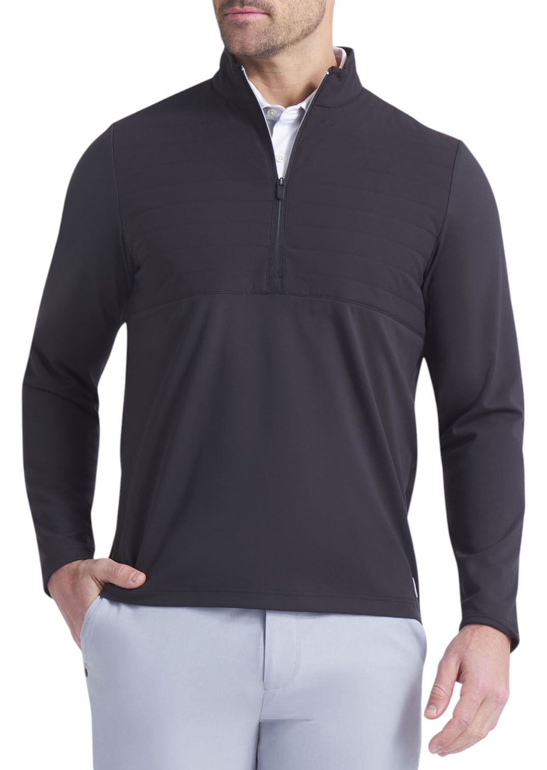 A hybrid layering piece designed for those unpredictable in-between days, featuring water-resistant, insulated panels across the chest and shoulders to keep you shielded from the elements. Whether you're on the course or out and about, it’s the ideal layer to keep you dry and comfortable without sacrificing mobility.