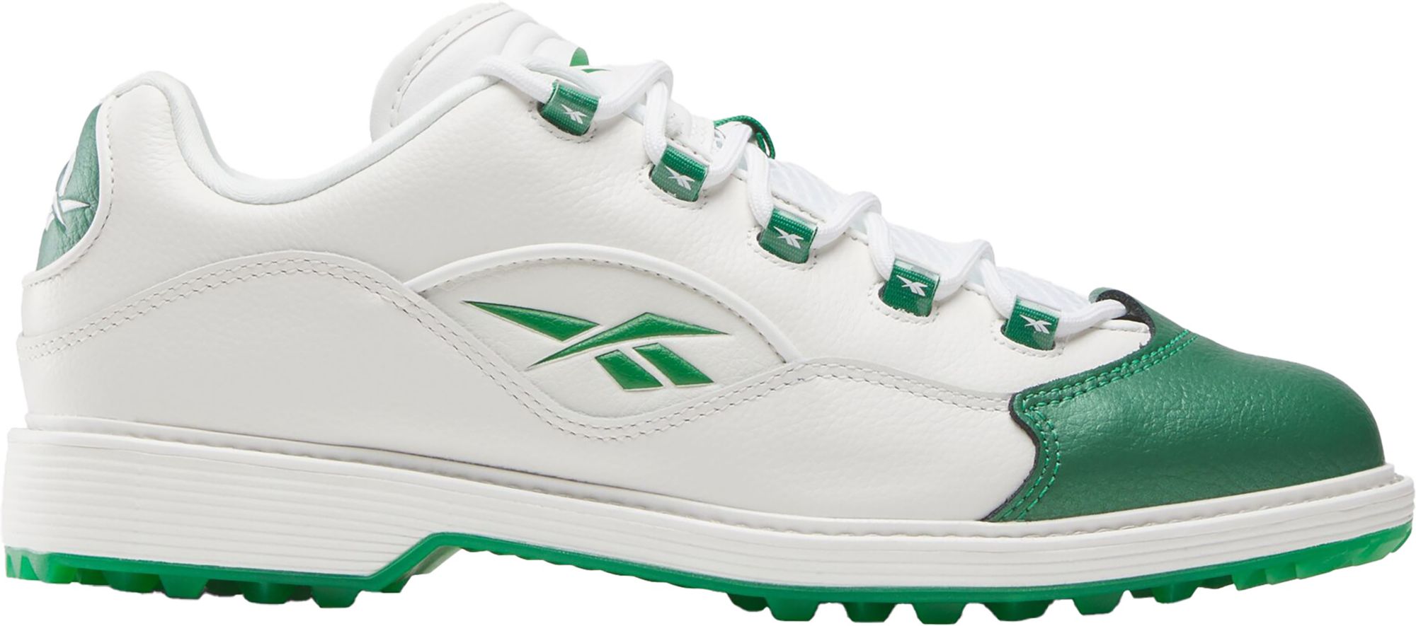 On the course or in the clubhouse, elevate your experience in these Reebok golf shoes. The full grain leather upper has a contrasting leather toe that's inspired by a heritage basketball silhouette. The spikeless crystal outsole makes it easy to transition from the links to the dining room.