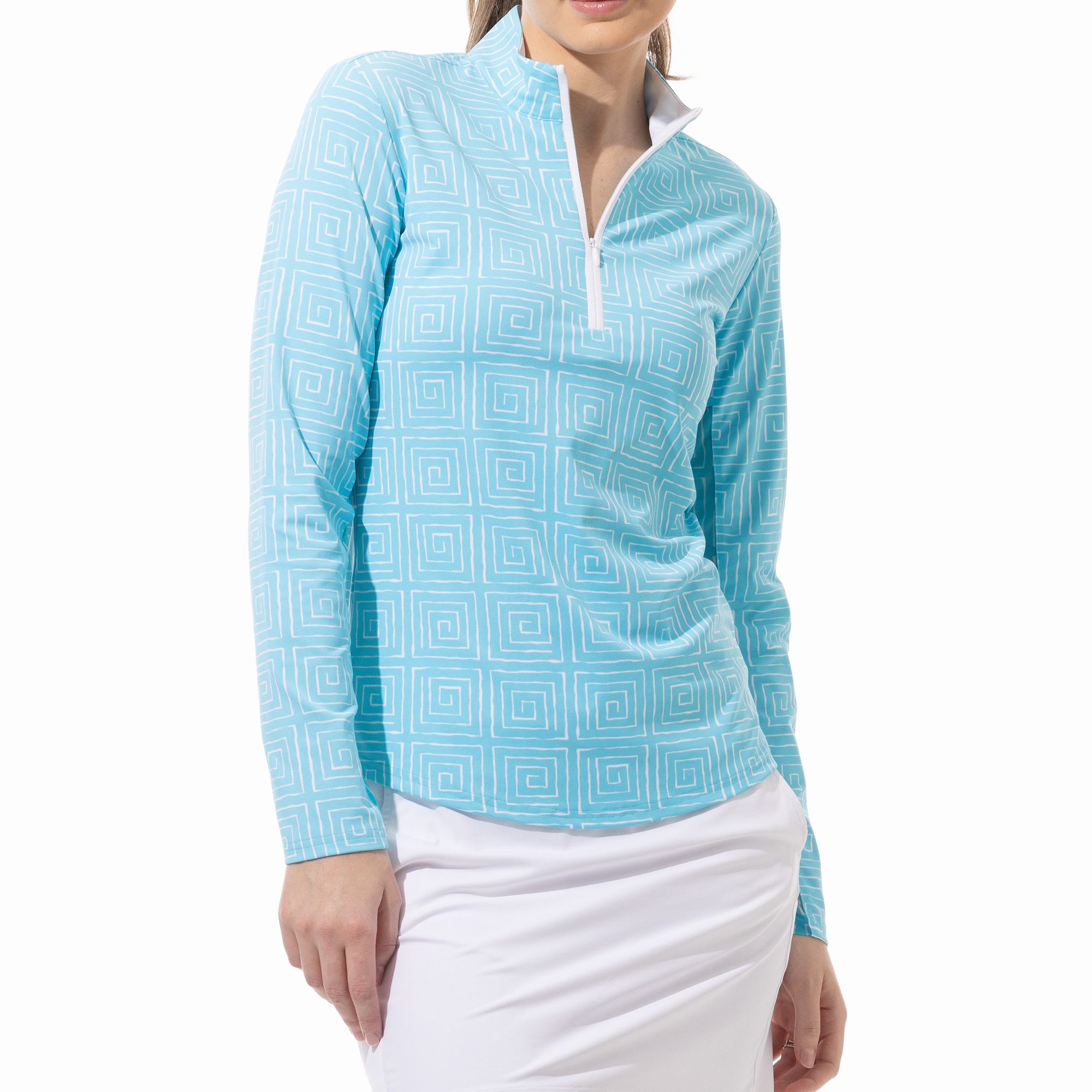 Show off your sporty style with this SanSoleil® printed ¼ zip pullover long-sleeve mock. Perfect for on and off the Golf course.