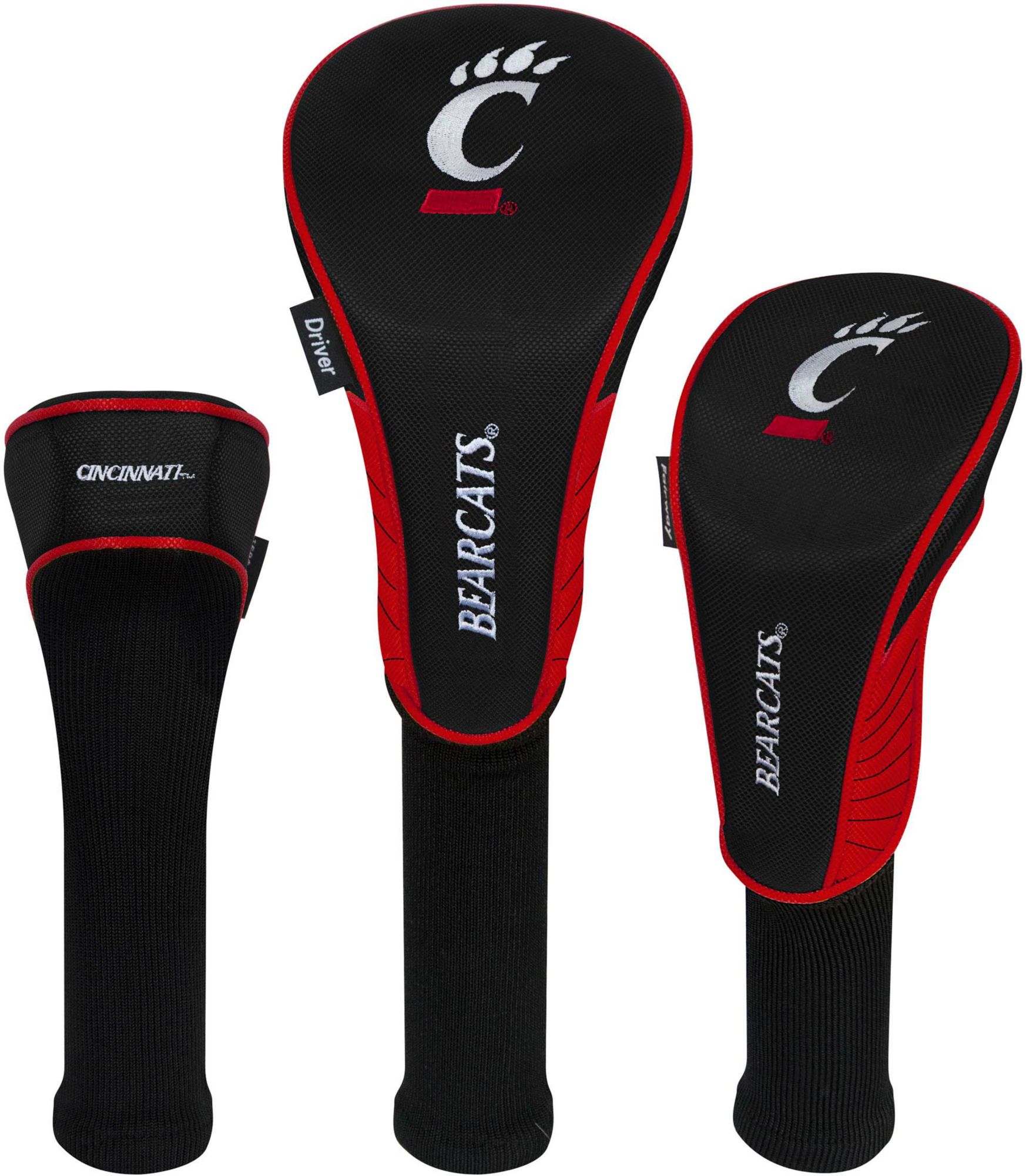 Boldly display your support for the Bearcats by protecting your metalwoods with Team Effort Cincinnati Bearcats Headcovers. Specifically designed to fit most driver, fairway wood and hybrid models, each premium headcover is constructed of rugged 420D nylon material and features a long neck design to deliver maximum club protection. Vibrant, contrasting team color elements combine with multiple team trademark embroideries to show your course mates who back on game day.