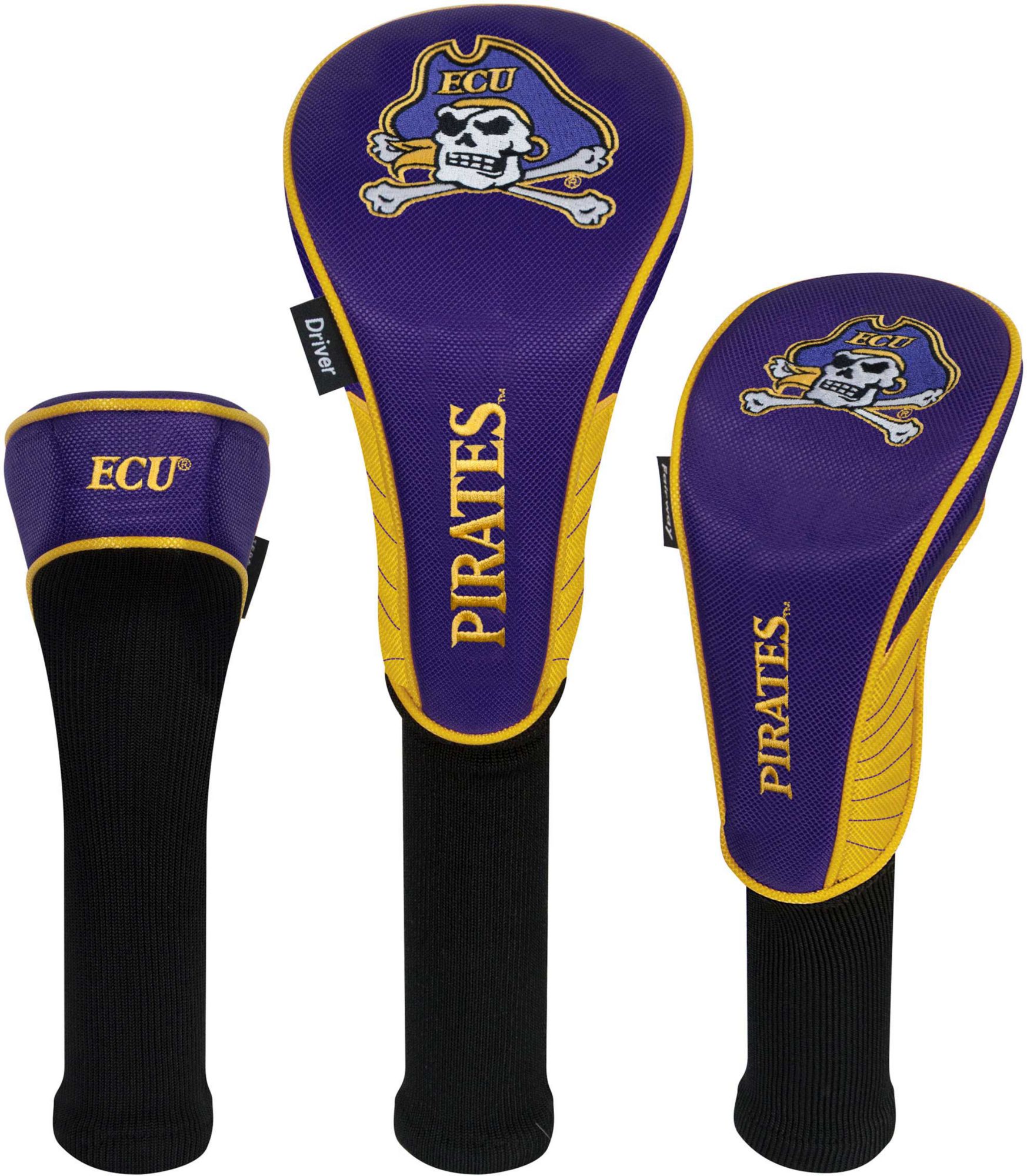 Boldly display your support for the Pirates by protecting your metalwoods with Team Effort East Carolina Pirates Headcovers. Specifically designed to fit most driver, fairway wood and hybrid models, each premium headcover is constructed of rugged 420D nylon material and features a long neck design to deliver maximum club protection. Vibrant, contrasting team color elements combine with multiple team trademark embroideries to show your course mates who back on game day.