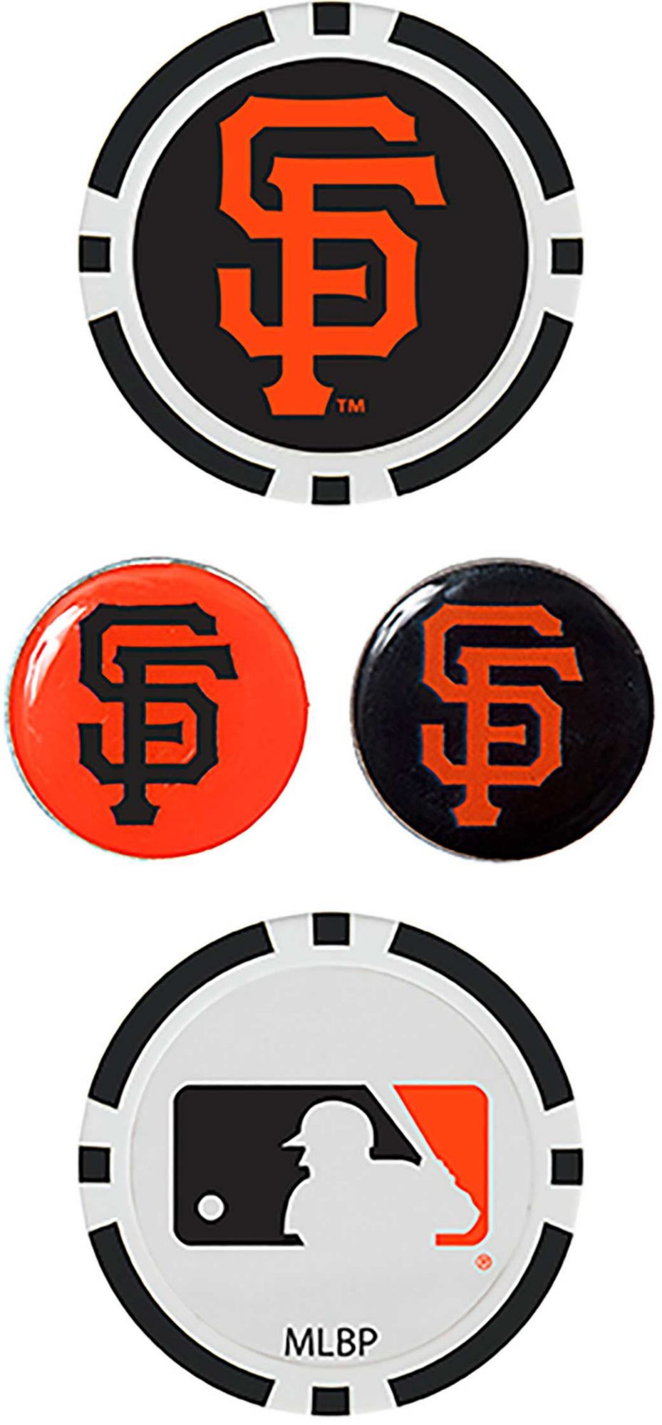 Remind your course mates of your pride in the Giants as you prepare for your putt with the Team Effort San Francisco Giants Ball Marker Set. Two 40mm poker chip style ball markers feature multiple team trademarks and provide an eye-catching take on alignment. Two 25mm iron stamped ball markers feature a full-color team trademark and are suitable for use with most magnetic hat clips for convenience. Leave no doubt about your Giants spirit with this unique ball marker set.