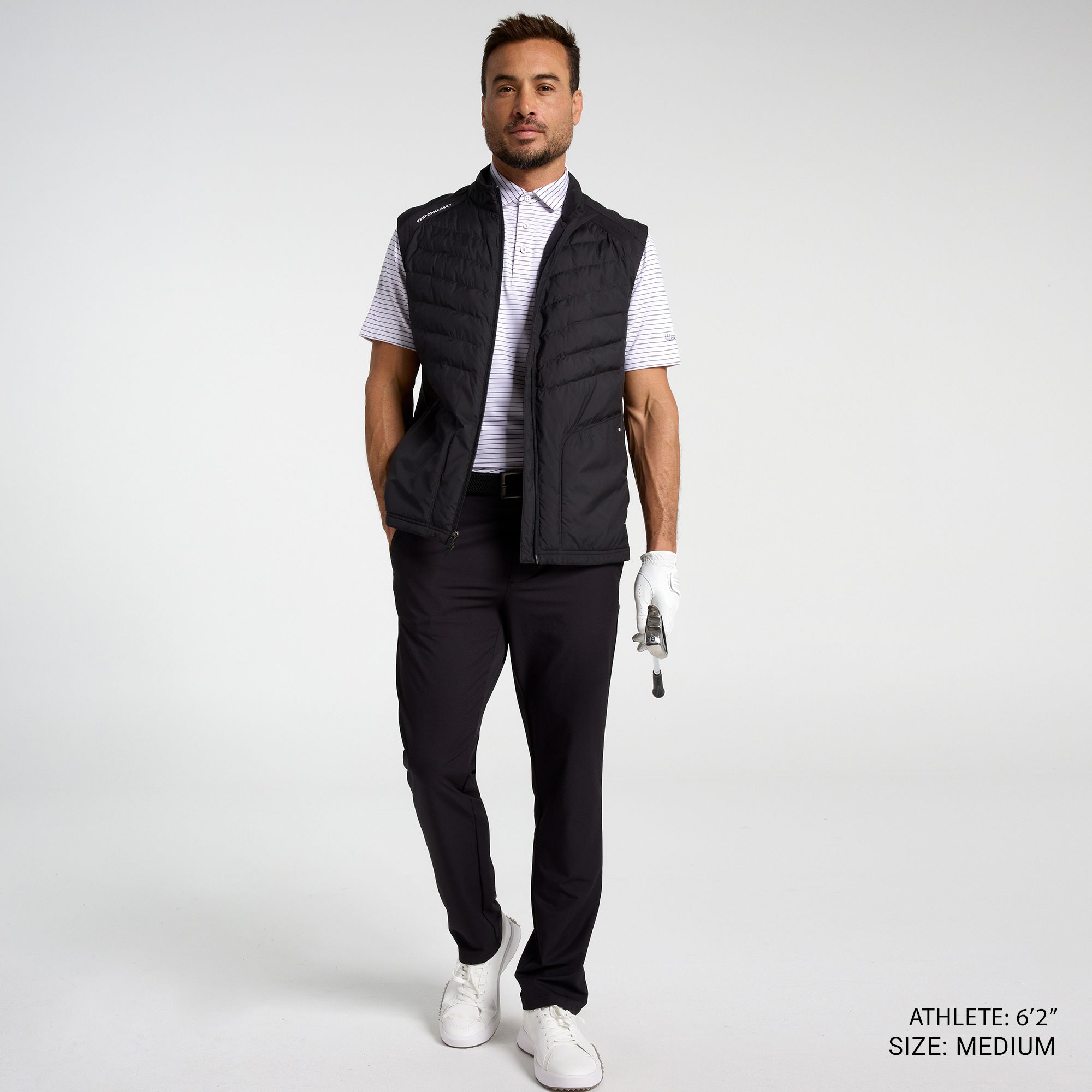 I’ve been really impressed with this vest. It’s versatile enough to wear on the course, around town, or as a light layer on cooler days. The fit in size M is true to size, with a clean, athletic look that isn’t too tight or too loose. The material is comfortable and provides a surprising amount of warmth without feeling bulky, which makes it perfect for layering. The pure black color looks sharp and goes with just about anything. Overall, the Walter Hagen P11 Hybrid Vest is a great blend of performance, comfort, and style. Highly recommended.