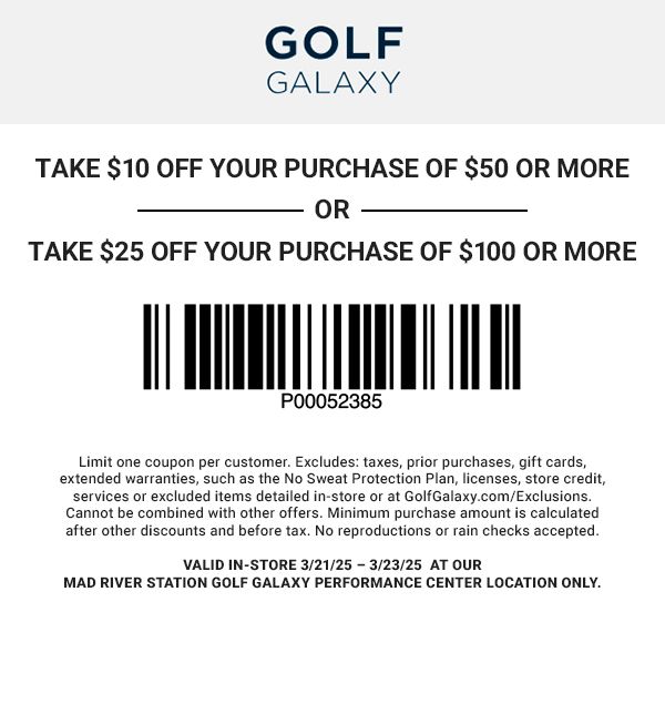 **Limit one coupon per customer. Excludes: taxes, prior purchases, gift cards, extended warranties, such as the No Sweat Protection Plan, licenses, store credit, services or excluded items detailed in-store or at GolfGalaxy.com/Exclusions. Cannot be combined with other offers. Minimum purchase amount is calculated after other discounts and before tax. No reproductions or rain checks accepted. Valid in-store 3/21/25–3/23/25 at our Mad River Station Golf Galaxy Performance Center location only.